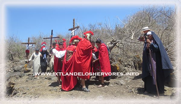 ..................Sin embargo. También es muy satisfactorio afirmar que este predio o ladera cerril que se escogió para tan dulce y tan substancial Obra caracterizada. Es un nuevo escenario que ahora se suma a la variedad de panoramas para inovar y enriquecer la diversidad de estantes para esta magna escenificación que realizan los jóvenes de Ixtlán. Para esta estupenda recreación que han hecho, sobre el pasaje de Cristo hacia su Crucifixión final en el Cerro de la Calavera. |