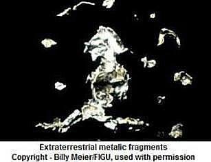 Los metales, por otro lado; “En el transcurso de sus investigaciones, el coronel Wendelle Stevens recibió de manos de Billy Meier varios fragmentos metálicos que supuestamente correspondían a tres de los componentes con qué se hallaban formadas las naves de los Pleyarianos. Los análisis de estas combinaciones, fueron llevados a cabo en la Universidad de Arizona, y rebelaron una compleja y extraña aleación de los fragmentos, ¡Pero eso sí! formada por elementos de la tabla periódica conocida, por lo tanto totalmente terrestre, aunque con otros elementos muy raquíticamente existentes en la tierra, es de reseñar que en uno de los fragmentos, se encontraron adentro del mismo unos pequeñísimos ¿cilindros? Insertados artificialmente”.(dts., por mundo parapsicologico y por biblioteca de las pléyades .Net) |